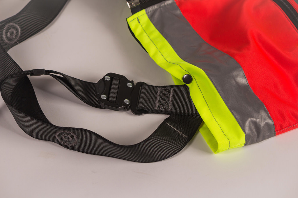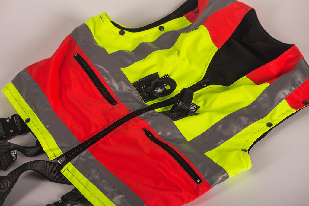 2 – farbige, moderne Warnweste DIN 20471 mit integriertem Sicherheitsgeschirr, Brust- und Rückenöse.